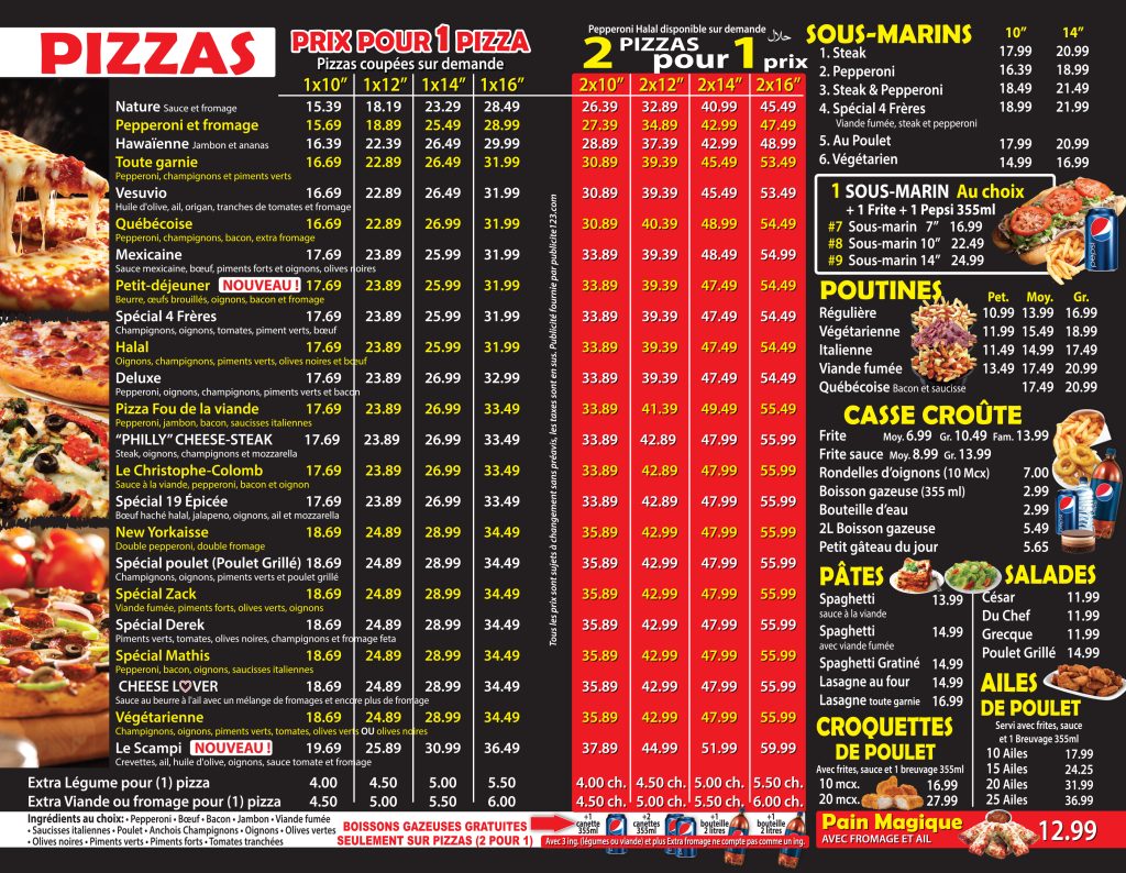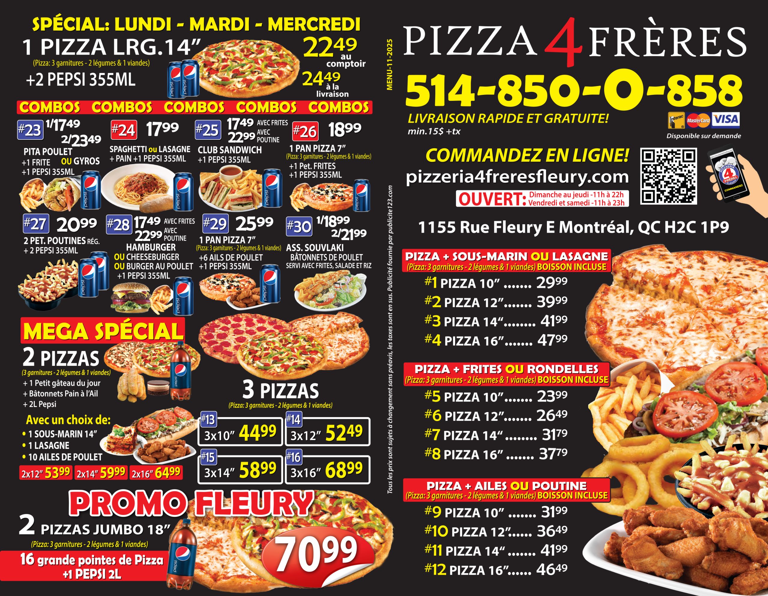 PIZZERIA4 FRÈRESFLEURY * Pizzas * Pâtes * Sous-marins * Poutines * Ailes * etc… VOIR Menu et COMMANDEZ PIZZA 4 FRÈRES 514-850-0858 1155 Rue Fleury E, Montreal, Quebec H2C 1P9